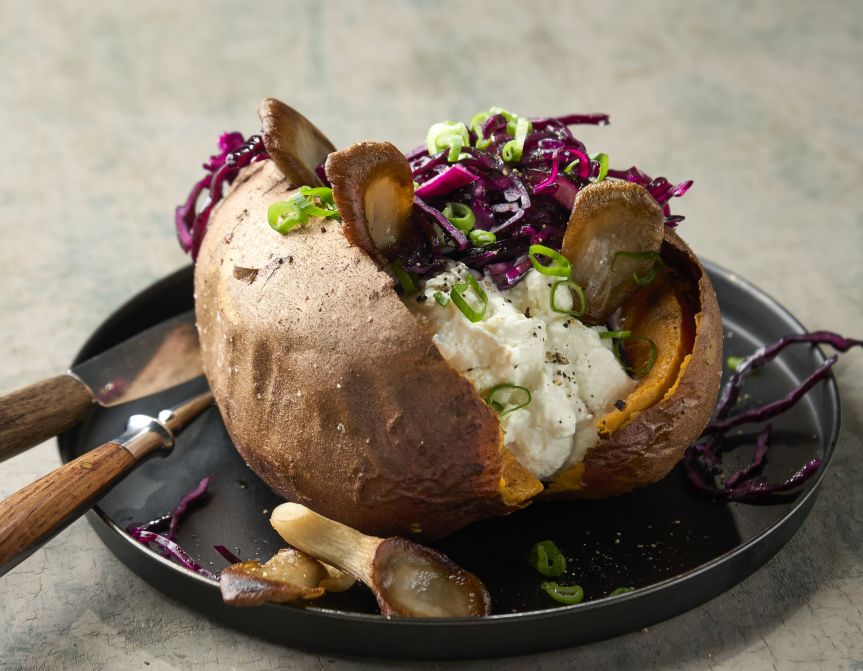 - Ofen-Süßkartoffel mit Rotkohl & Austernpilzen