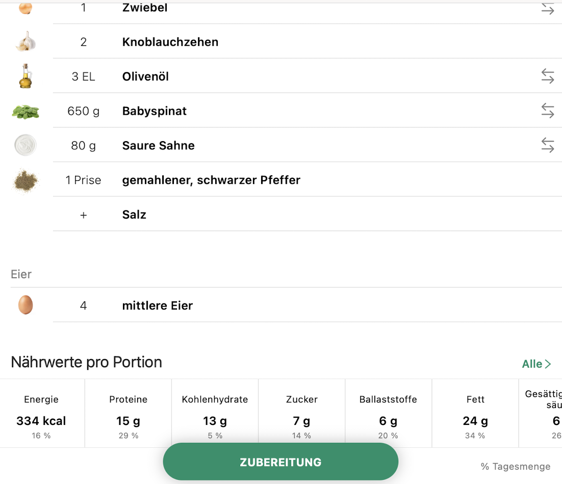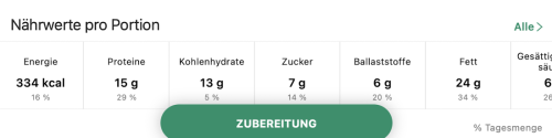 Tipp: Damit du dir nach dem Vorbild der Nährwertangaben auf Lebensmitteln auch bei unseren Rezepten einen Überblick über die Nährwerte der Einzelrezepte verschaffen kannst, findest du die wichtigsten Angaben jeweils am Ende der Zutatenliste. Wir verraten genau, wie viel Energie, Proteine, Kohlenhydrate, Zucker, Ballaststoffe, Fette und ungesättigte Fettsäuren pro Portion enthalten sind und geben auch an, wie viel Prozent von der empfohlene Tagesmenge orientiert am Bedarf einer Durchnittsperson der Wert ausmacht. Mit nur einem Klick kannst du dir an dieser Stelle noch weitere Nährwertangaben anzeigen lassen.
