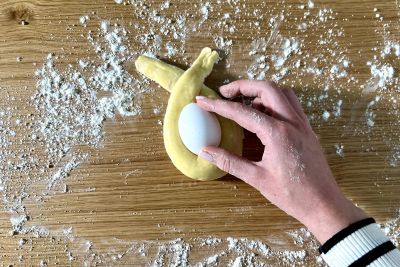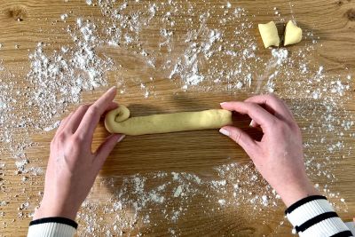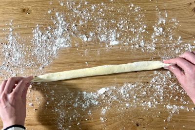 - Divide the finished dough into eight equal parts. These are then simply rolled into strands with your hands. Taper both ends of the roll slightly, as these will become the bunny ears.