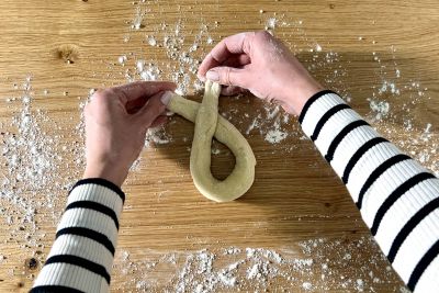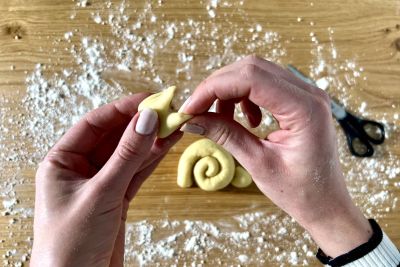 - The remaining main strand is rolled up into a spiral on the baking tray lined with baking paper from the inside out, like a cinnamon bun.