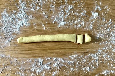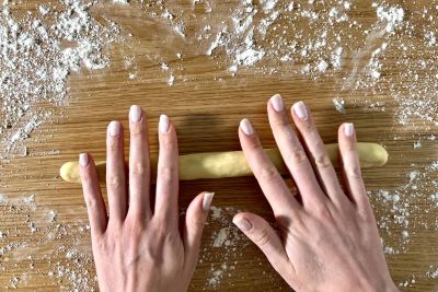 - Divide the finished dough into eight equal parts and roll them into strands with your hands.