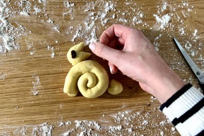 - Cut dough with scissors to create the ears. Place a raisin as an eye on the head.