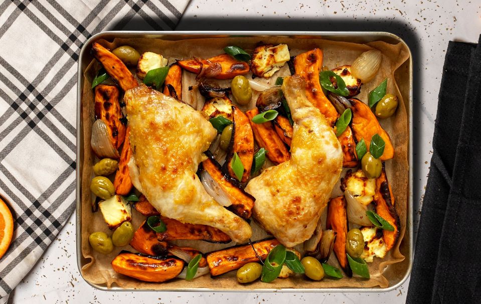 Chicken legs with sweet potatoes & feta